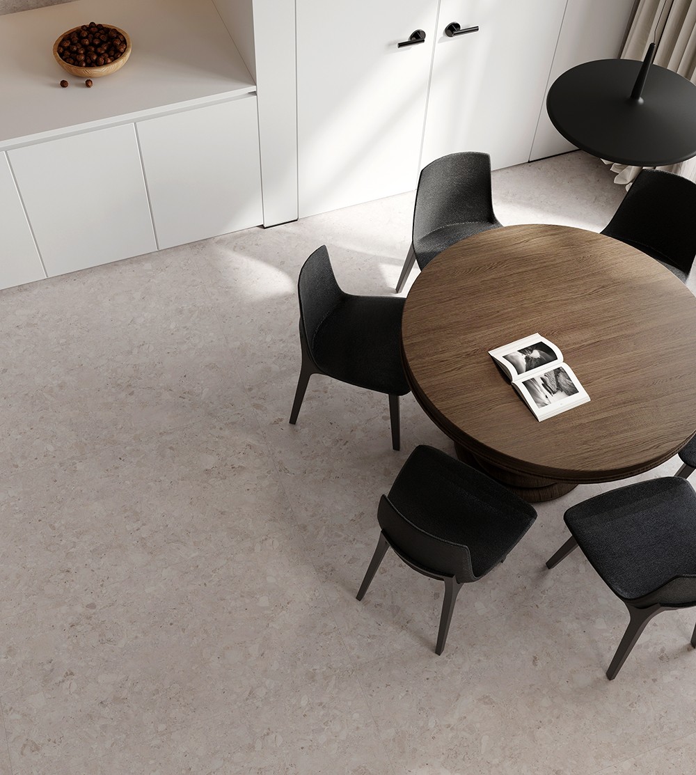 銀灰大顆粒石紋,柔和灰色磚面上滿布不規則的顆粒色塊,沉穩而不失雅致。