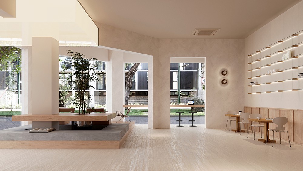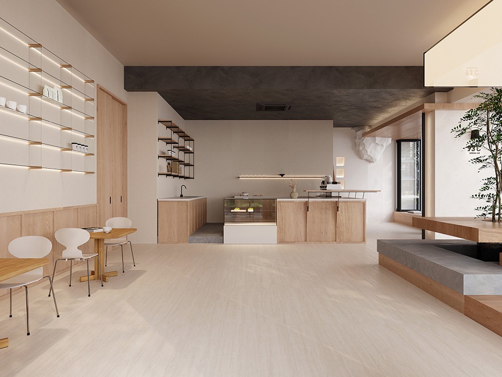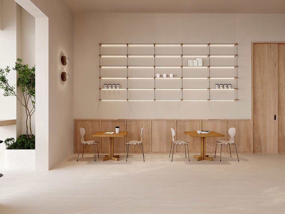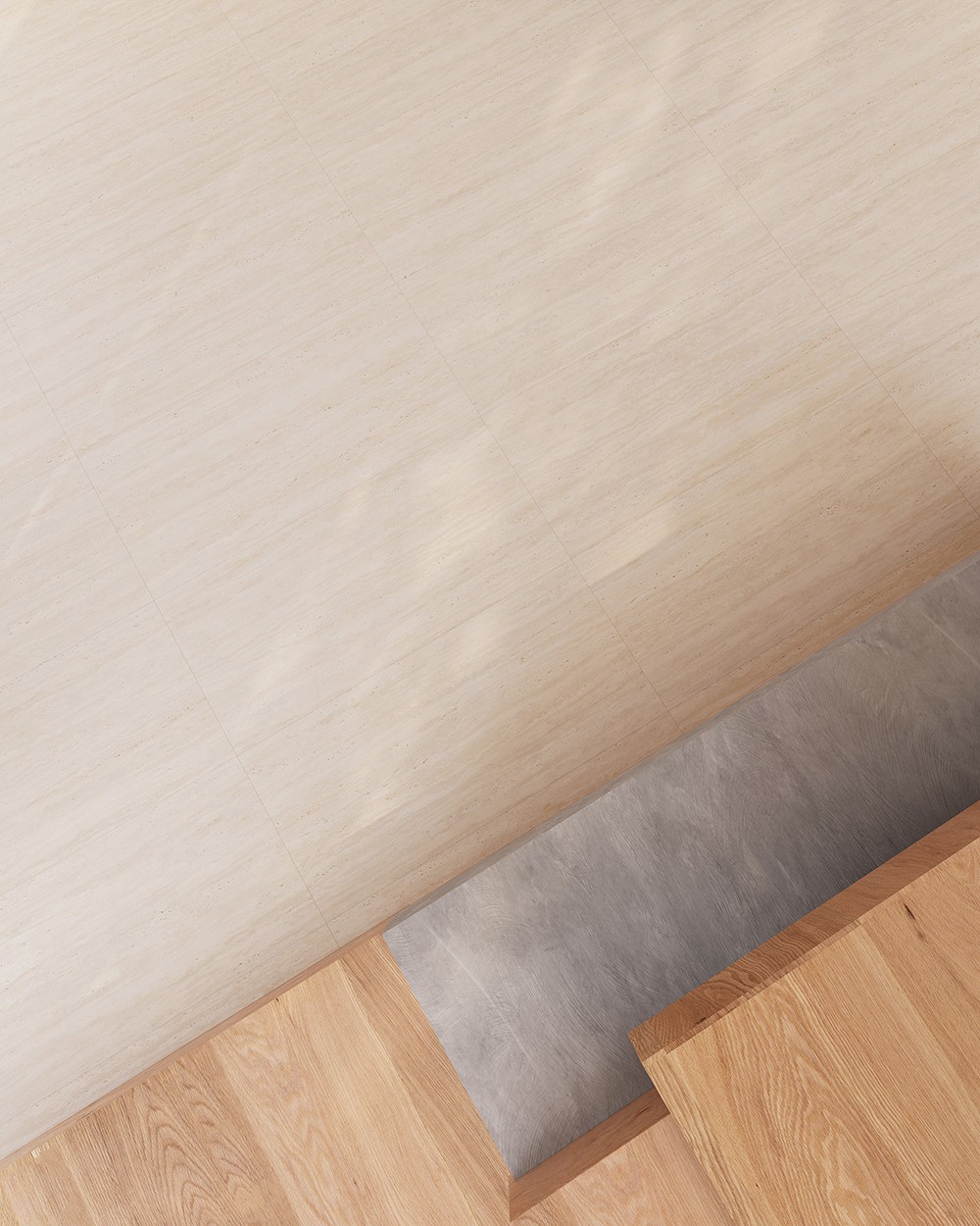 米白基底之上,細(xì)膩洞石紋理如微孔密布、疏密有致,柔和光影間透出天然石材的溫潤呼吸感。